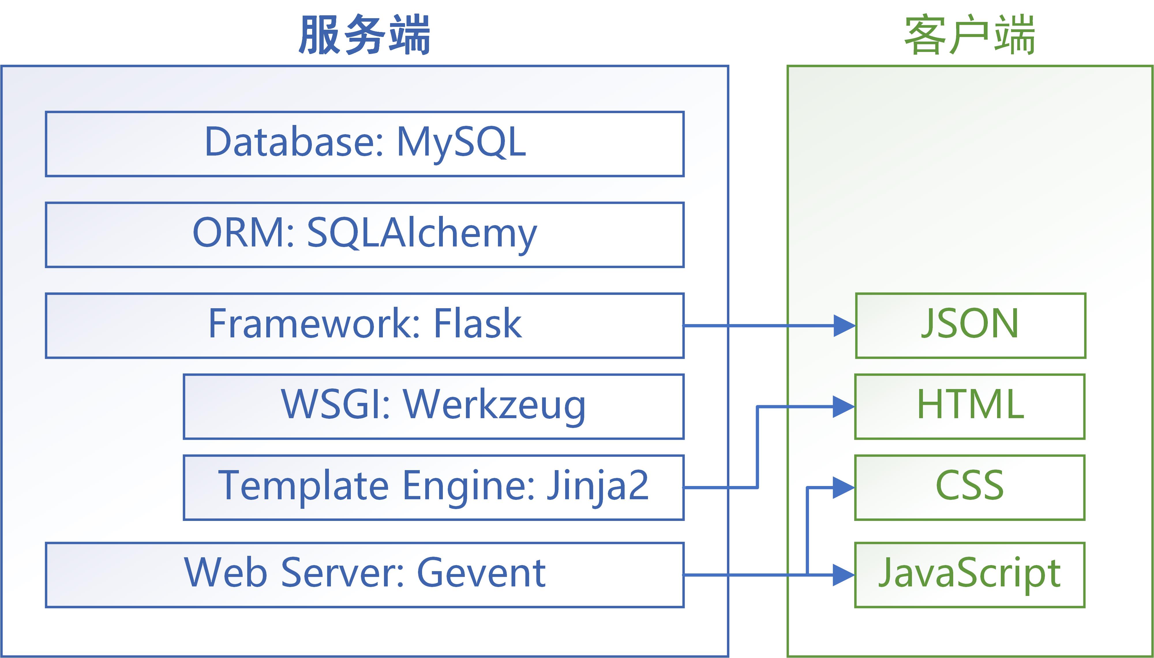 为了快速上线,后端咱就用了 Python。框架采用 Flask,是一个采用模块化设计理念的 Web 应用框架,也被称为微框架。Flask 没太多默认配置,可以通过 Flask-extension 引入如 MySQL ORM,模板引擎,表单和身份验证等插件。程序使用 MVC 分层架构,便于协作开发和后续扩展,同样为了加速,暂时使用 Jinja2 模板生成器糊出来的前端。