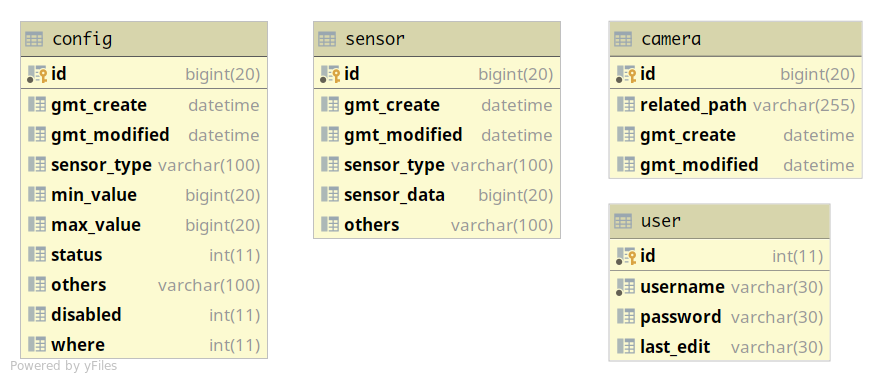 参见 E-R 图,config 表保存传感器节点的状态,包括传感器类型,环境数据最大值和最小值,传感器或执行器状态,上次动作源等。sensor 表保存传感器历史数据,外键连接 config 表。camera 表保存连续运动的发生时间和截图路径。user 表储存用户信息,包括登录名称,用户邮箱,密码等数据。