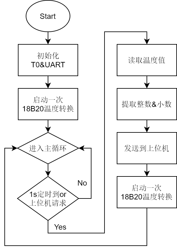 控制温度节点的程序运行在 8051 MCU 上,使用 C 语音开发。如下图,功能是每隔 1s 上传一次温度信息,或者在上位机请求时立即上传温度信息。